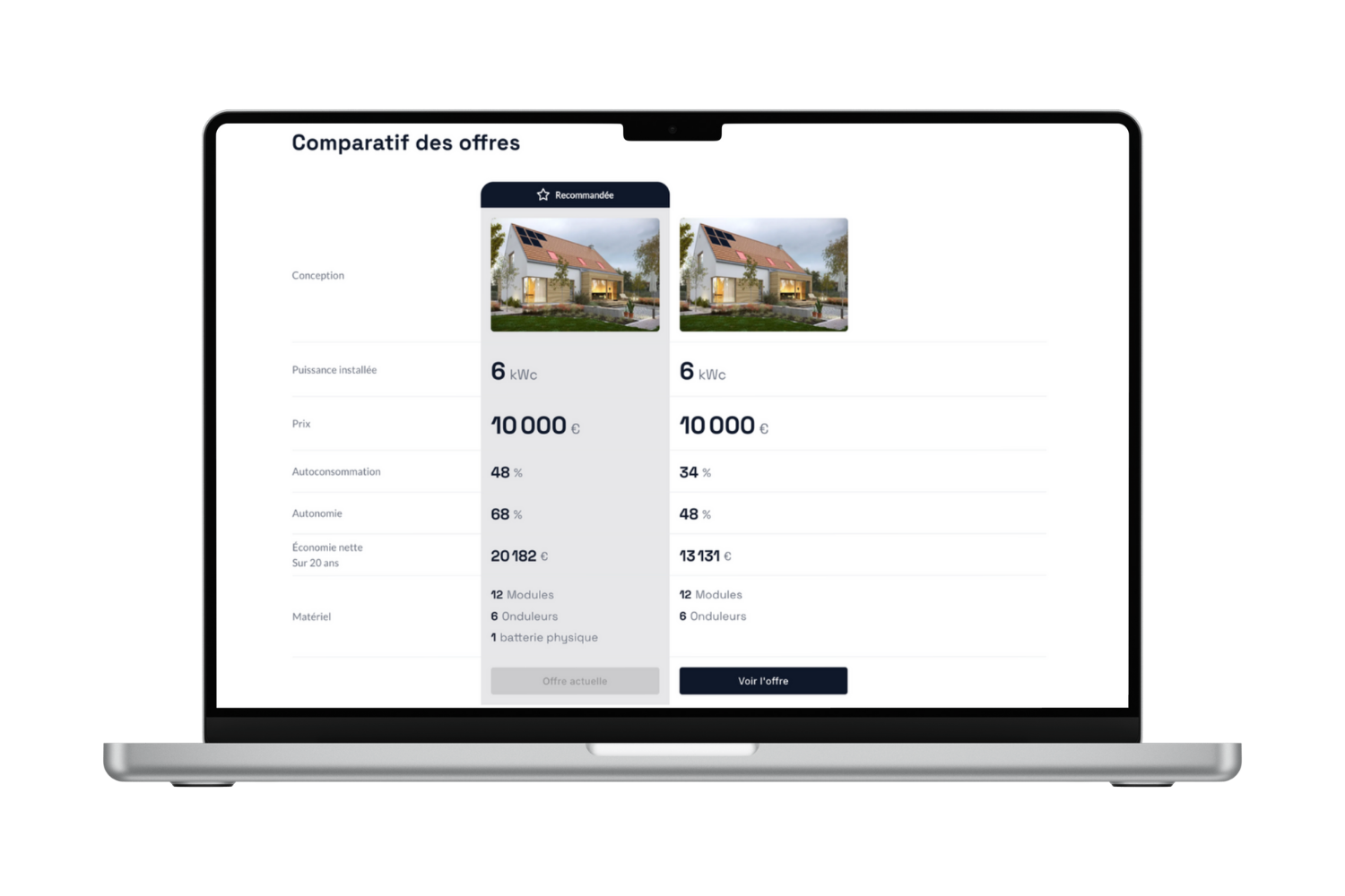 - Comparaison d’offres (revente totale ou autoconsommation, batterie physique ou virtuelle, etc.),